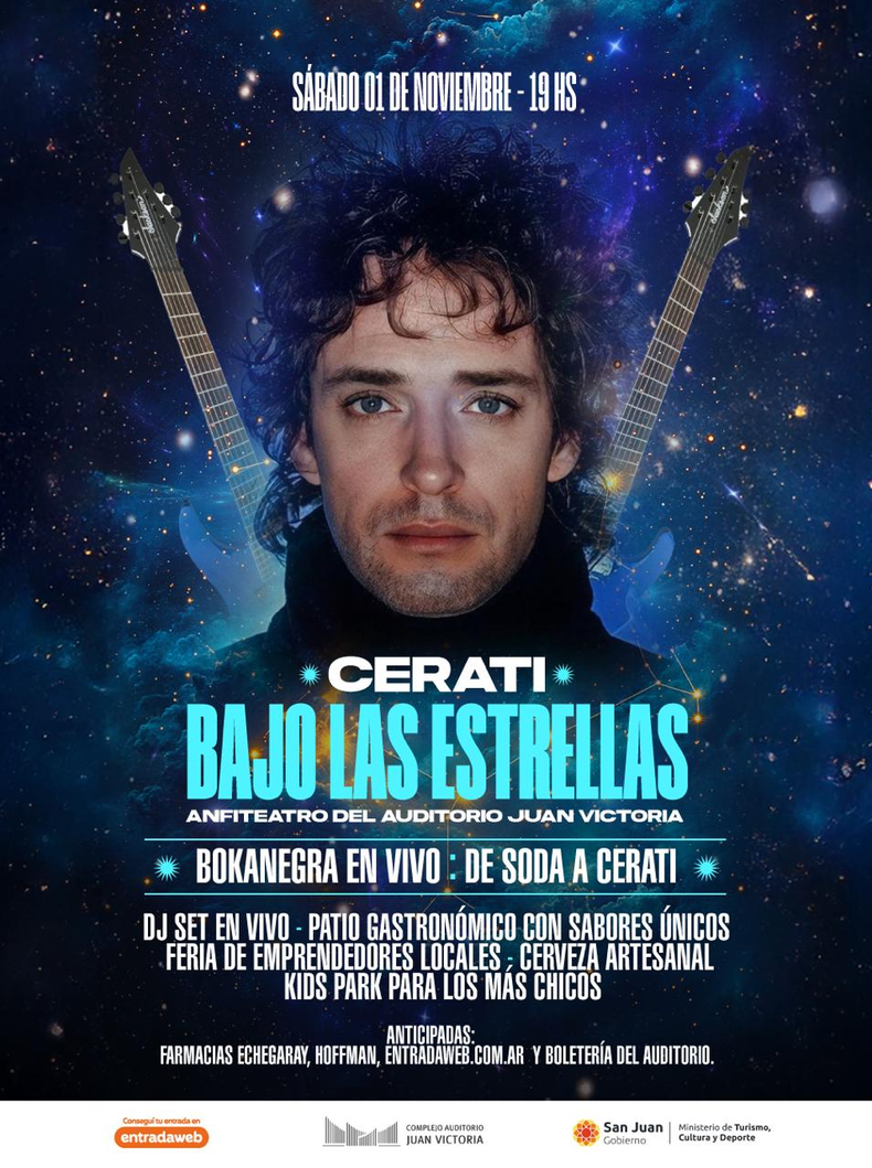 El próximo sábado 1 de noviembre, los Jardines del Auditorio Juan Victoria se convertirán en el escenario de una experiencia única que combinará música, gastronomía, arte y comunidad. Bajo el título “Cerati bajo las estrellas”, el evento promete una velada inolvidable para los amantes de Gustavo Cerati y la buena música.