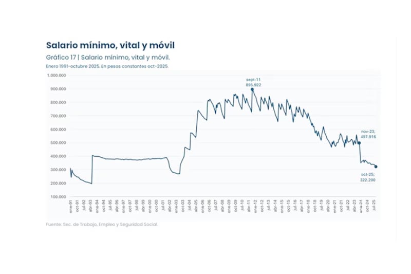 El SMVM es clave porque se toma como referencia para negociaciones salariales, mediciones estadísticas o prestaciones sociales. Desde diciembre de 2023 se devaluó más de 35% con respecto a la inflación