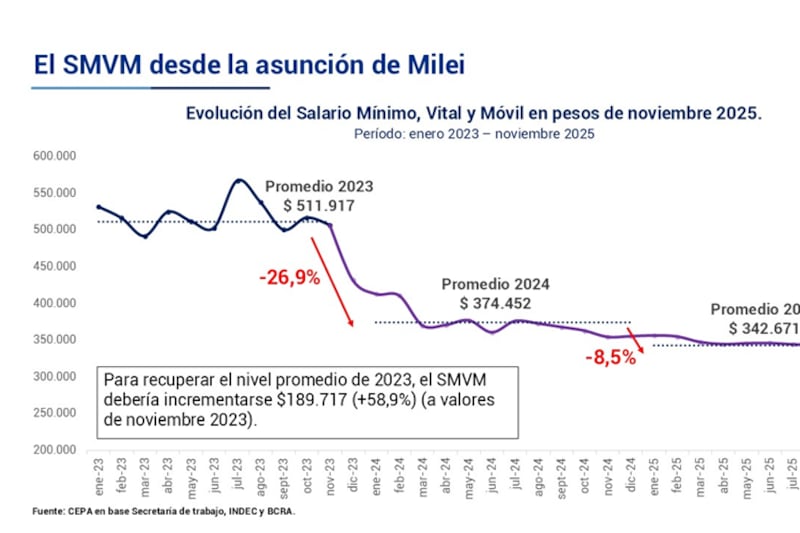 El SMNV actual es el más bajo desde la crisis a la salida de la Convertibilidad. Un informe del Centro de Economía Política Argentina (CEPA), con datos de la Secretaría de Trabajo, alerta que el haber mínimo actual está incluso 6% debajo del promedio de la década de 1990 ($342.483 a precios de hoy).